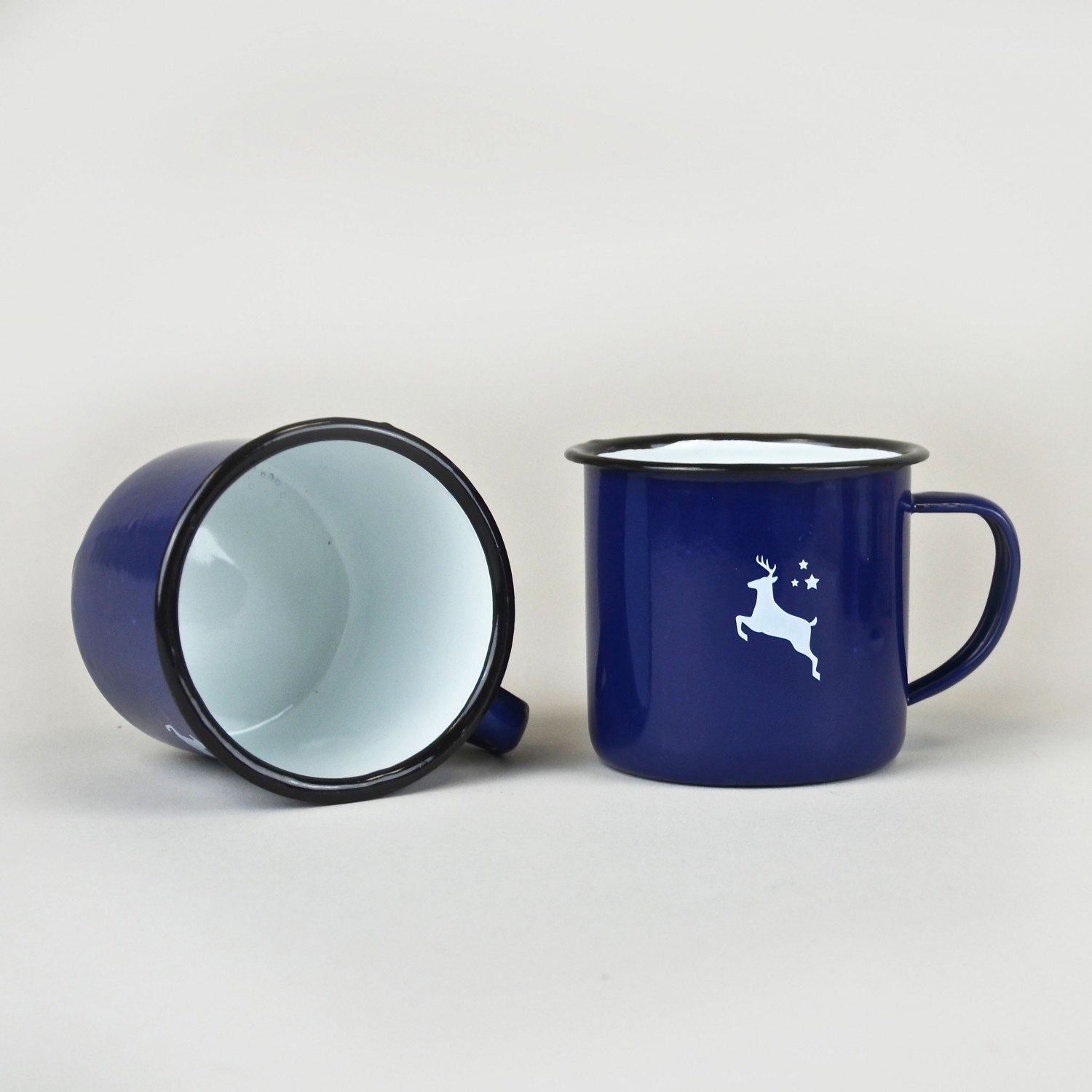 Emaille-Becher Retro - Mit Henkel, außen blau mit Winterhirsch Aufdruck und innen weiß. Details: