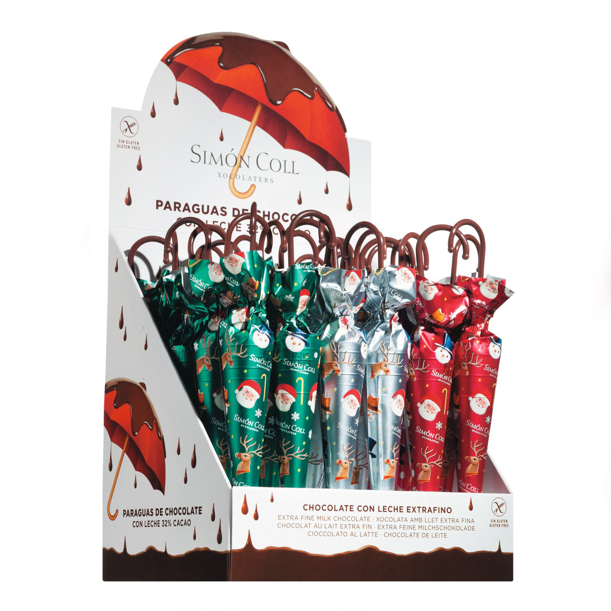 Kleine Schirme aus Vollmilchschokolade in rotem, grünem oder silberfarbigem Papier mit weihnachtlichen Motiven. Gesamtlänge 20 cm. Als kleines Mitbringsel, zum Nikolaus, für den selbst gestalteten Adventskalender oder einfach überall, wo weihnachtliches Flair gewünscht wird.