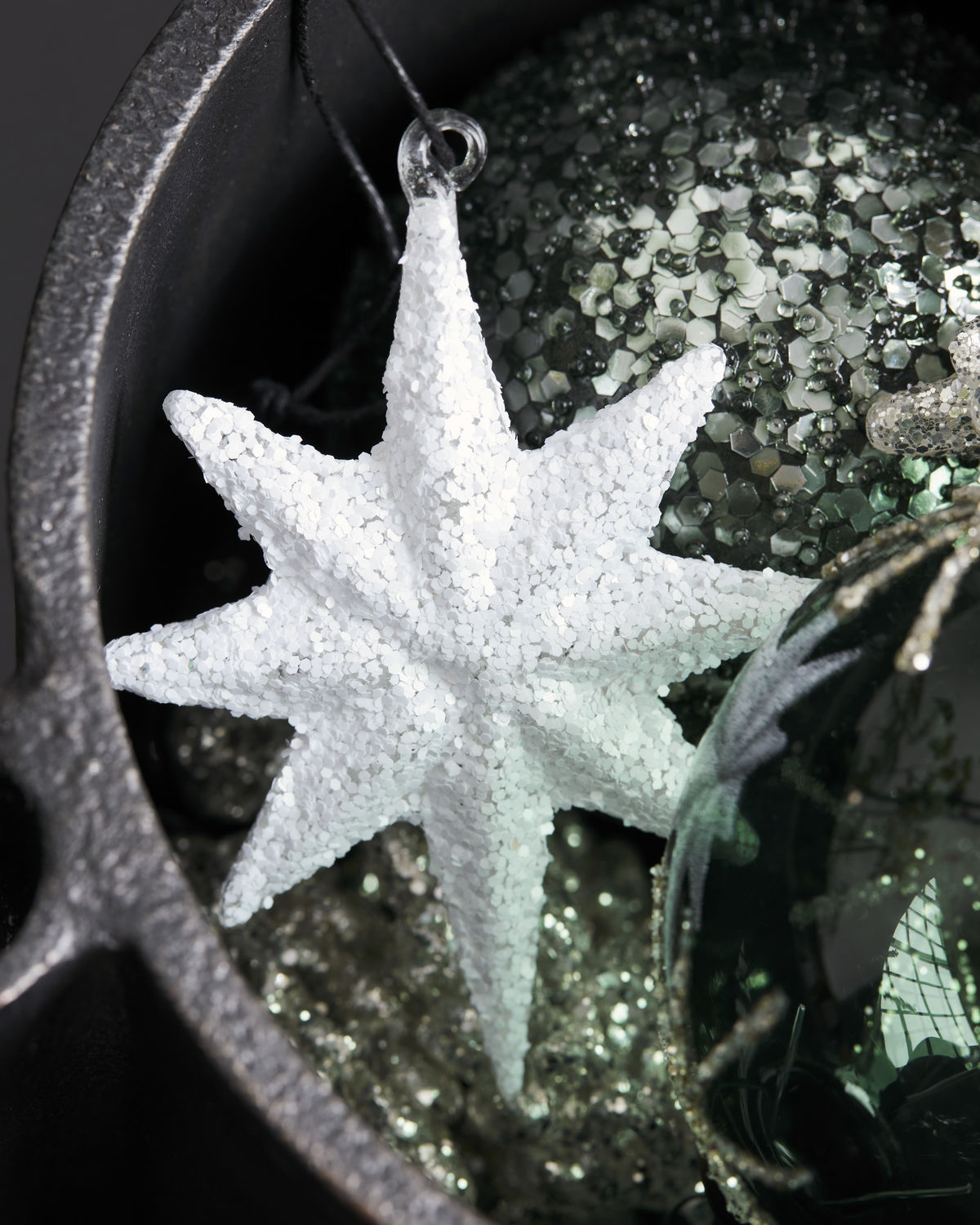 Chunky ist ein klassischer Weihnachtsbaumanhänger. House Doctor hat dem Glasornament eine traditionelle Sternenform gegeben und ihn mit einer weißen Farbe mit Glitzer überzogen, um das Design abzurunden. Die Größe ist perfekt als Baumschmuck, zusammen mit anderen Anhängern als Fensterschmuck oder als Tischdeko geeignet. Mach Glitzer und kalte Töne zum Motto deiner Weihnachtsdeko und kombiniere den Stern mit silbernen Anhängern in verschiedenen Formen, um einen farblich perfekt abgestimmten Weihnachtsbaum zu kreieren. Egal welche Richtung du mit deiner Deko einschlagen wirst, dieser Anhänger sorgt für Leichtigkeit und die richtige Stimmung.
